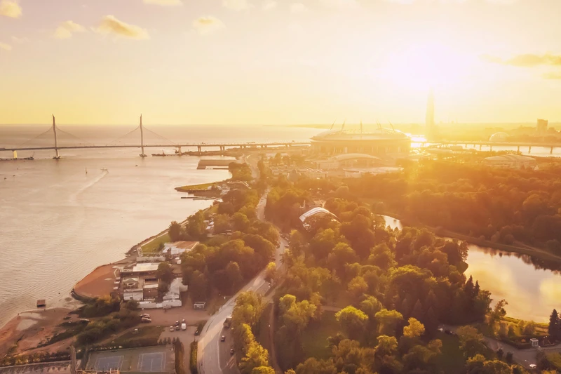 Панорамы имперского города: Ждановская набережная, мосты, архитектура Петроградской стороны, зелёные острова Крестовский и Елагин.