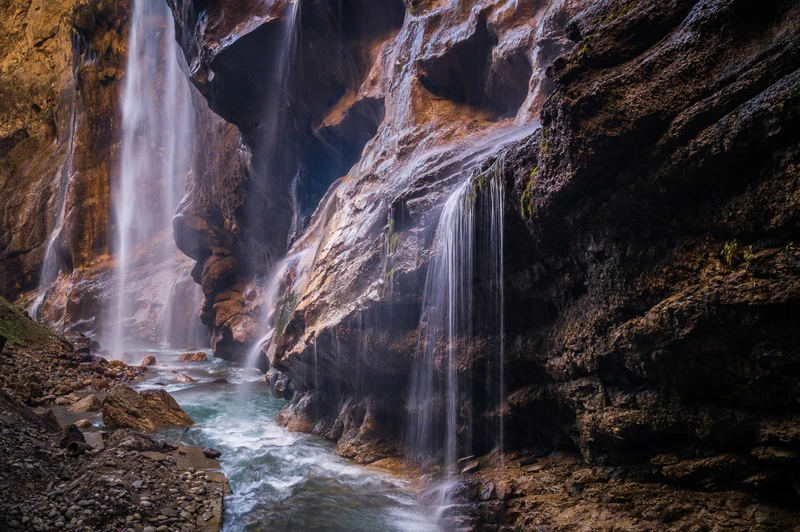 Чегемские водопады. Здесь река, протекая через ущелье, прорезается через скалы и распадается на множественные «плачущие» водопады. Зимой, застывая, они образуют эффектные ледяные скульптуры.
